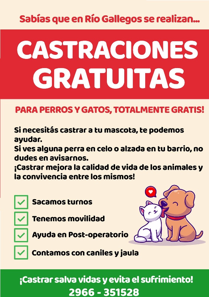 Aquellos vecinos de la ciudad de Río Gallegos que deseen castrar a sus mascotas o alguna mascota del barrio y que no puedan acceder a la posibilidad de hacerlo pueden comunicarse al número 2966-351528.