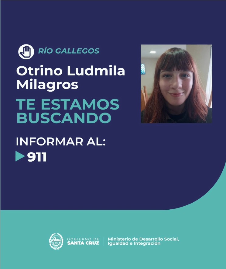 El Ministerio de Desarrollo Social de la provincia de Santa Cruz lanzó un comunicado a través de sus canales de difusión oficiales por medio del cual anunció la búsqueda de una joven de 16 años de edad oriunda de la ciudad de Río Gallegos.
