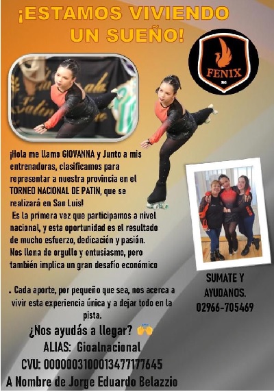 Aquellas personas que deseen colaborar para que Giovanna y sus entrenadoras puedan viajar al Torneo Nacional de Patín pueden hacerlo a través del ALIAS “GIOALNACIONAL” a nombre de Jorge Eduardo Belazzio o comunicarse al número 2966-705469.