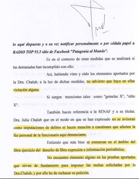 La actual titular de la Secretaría de Niñez había solicitado una serie de medidas restrictivas y sanciones económicas en contra de ambas periodistas por una serie de presuntas expresiones vinculadas a diferentes casos que involucran a dicha Secretaría y que, actualmente, se encuentran judicializados como el caso de Nicole Díaz, la niña que falleció mientras se encontraba bajo la órbita municipal. A pesar de la insistencia por parte de Chalub, finalmente el tribunal determinó que “no hubo incumplimiento ni violación alguna” ya que dichas expresiones se encuentran enmarcadas en el ejercicio legítimo del periodismo y del derecho a la libre expresión y, en este marco, Bersanelli indicó que “no se acreditó ningún perjuicio ni daño efectivo a menores de edad” ya que las publicaciones hechas por ambas periodistas se encuentran “amparadas por la libertad de expresión, especialmente cuando involucran asuntos de interés público y control institucional".