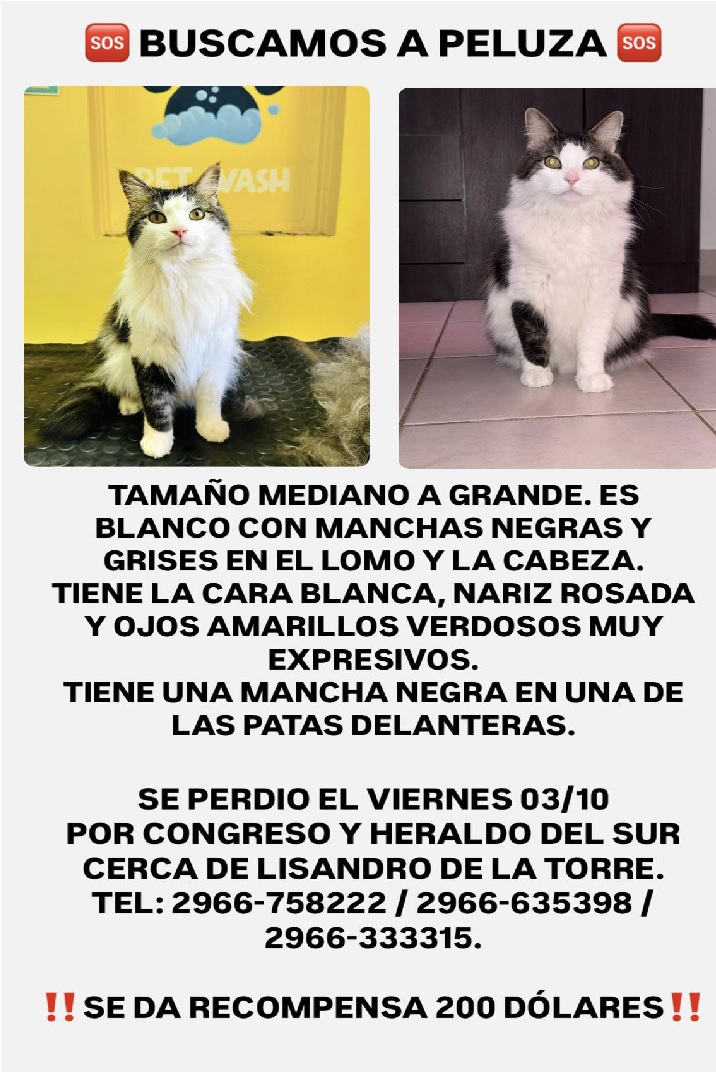 En el mismo posteo, la familia detalló que el gatito Peluza se encuentra desaparecido desde el pasado viernes 03 de octubre y que fue visto por última vez en la intersección de las calles Congreso y Heraldo del Sur de la ciudad capital.