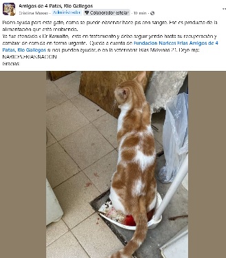 Un nuevo pedido solidario se comenzó a compartir momentos atrás en un reconocido grupo de proteccionismo animal de Facebook de la ciudad de Río Gallegos. En el mismo la reconocida proteccionista animal local, Cristina Musso, compartió el caso de un gatito que se encuentra atravesando una grave infección urinaria que produce que su orina se encuentre repleta de sangre.