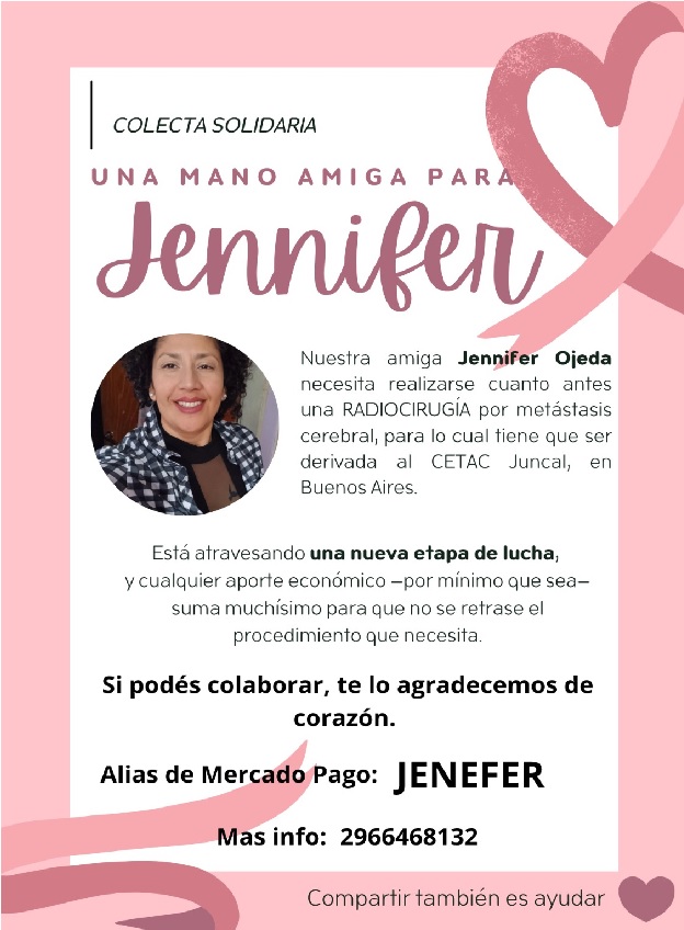 “Nuestra amiga Jennifer Ojeda necesita realizarse cuanto antes una radiocirugía por metástasis cerebral, para lo cual tiene que ser derivada al CETAC Juncal en Buenos Aires”, indicaron en el flyer de la campaña el cual fue ampliamente compartido por medio de las redes sociales.