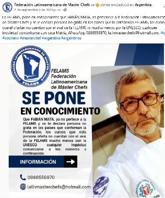 El pasado 2 de septiembre, la Federación Latinoamericana de Master Chefs emitió un comunicado por medio de sus canales de difusión oficiales para dar a conocer su desvinculación con el reconocido chef Fabián Mata. En el mismo comunicado, señalaron que el chef fue declarado persona no grata en todos aquellos países que conforman la FELAMS: “Se pone en conocimiento que Fabián Mata ya no pertenece a la FELAMS y se le declara persona no grata en los países que conforman la Federación”, indicaron al igual que reiteraron que “los cursos que esta persona dicta no cuentan con el aval de la FELAMS y, mucho menos, de la UNESCO”, apuntaron.